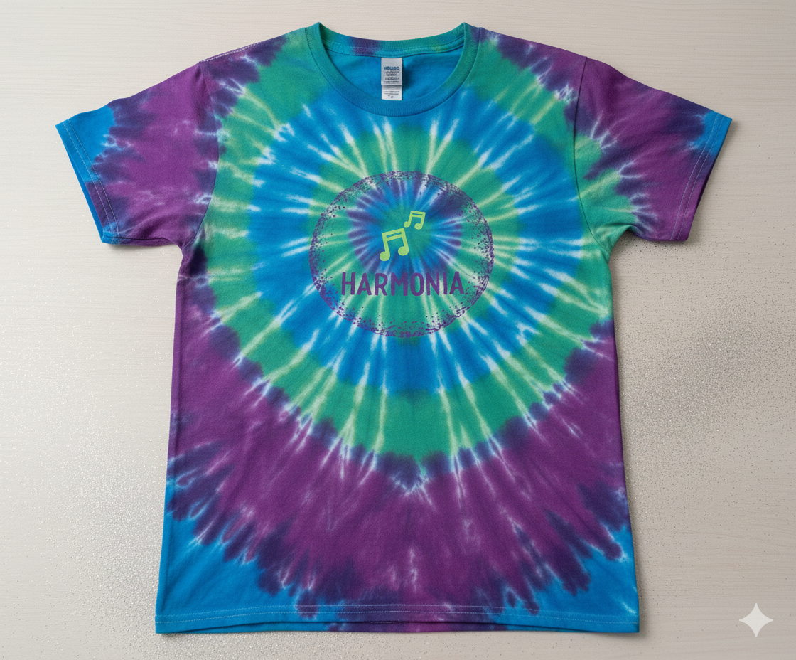 Affichez votre esprit Harmonia avec ce T-shirt incontournable ! Vous pouvez le retrouver en différentes couleurs, notamment le bleu électrique uni ou un Tie-Dye psychédélique vibrant (vert, bleu et violet). Chaque modèle arbore fièrement le grand logo HARMONIA sur la poitrine. Un essentiel confortable, coloré, et parfait pour célébrer.